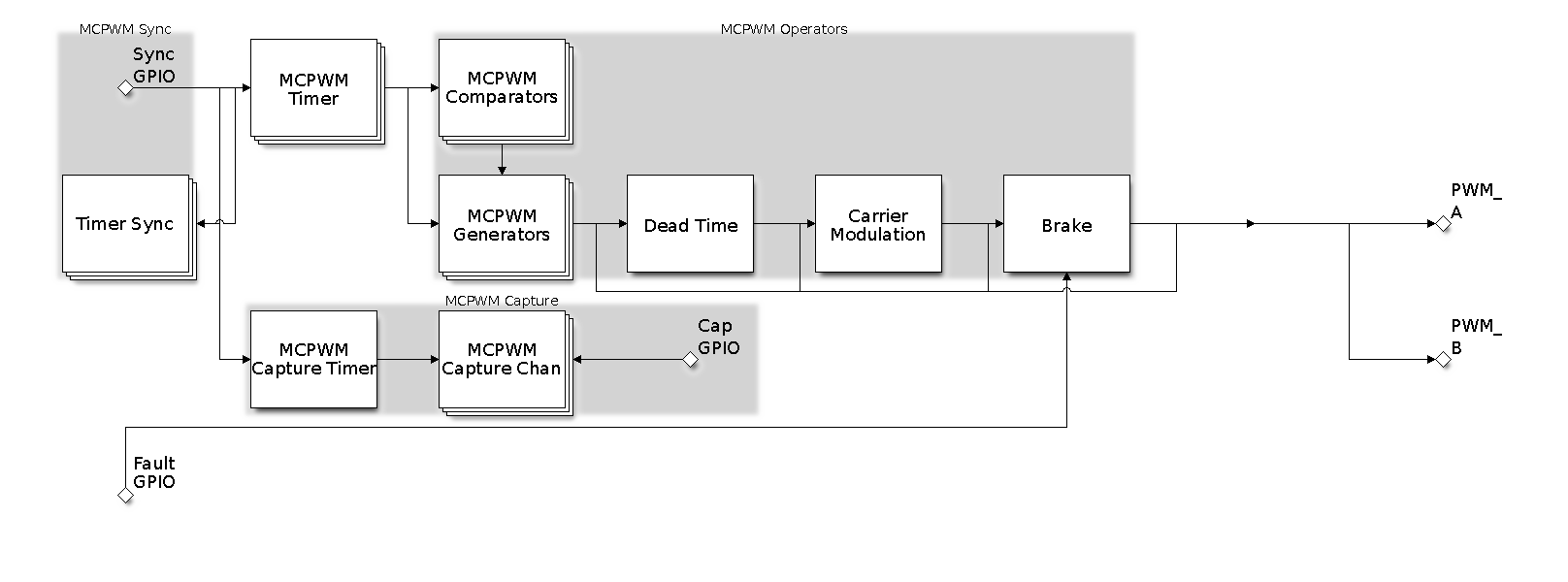 MCPWM Fault : The fault module is used to detect the fault condition from outside, mainly via the GPIO matrix. Once the fault signal is active, MCPWM Operator will force all the generators into a predefined state to protect the system from damage.