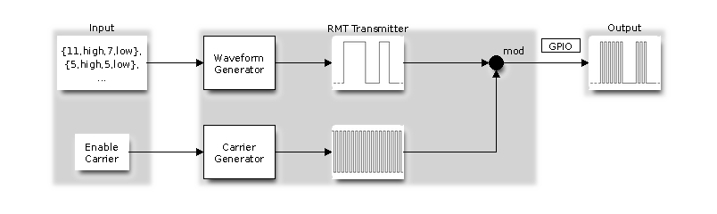 The driver encodes the user's data into RMT data format, then the RMT transmitter can generate the waveforms according to the encoding artifacts. It is also possible to modulate a high-frequency carrier signal before being routed to a GPIO pad.