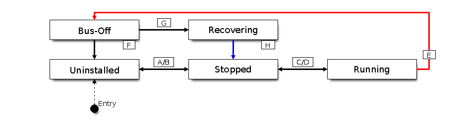 Bus-Off: A node becomes Bus-Off when the TEC becomes greater than or equal to 256. A Bus-Off node is unable influence the bus in any manner (essentially disconnected from the bus) thus eliminating itself from the bus. A node will remain in the Bus-Off state until it undergoes bus-off recovery.