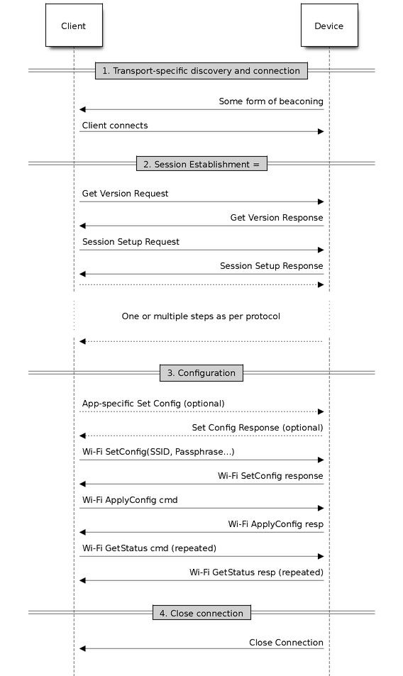 The protocol can work on Wi-Fi (SoftAP + HTTP server) or on Bluetooth LE as a transport protocol. The framework provides an ability to add support for any other transport easily as long as command-response behavior can be supported on the transport.