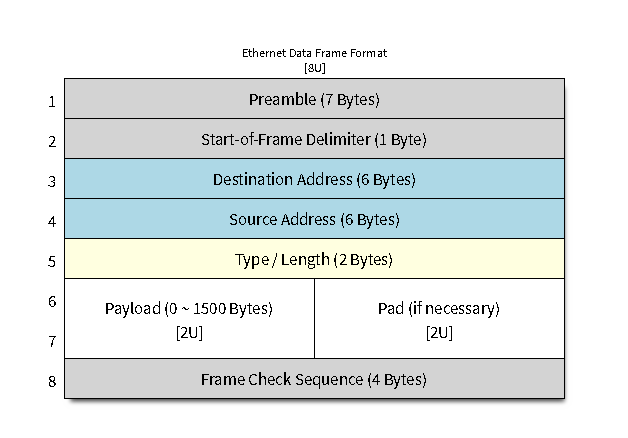 符合 IEEE 802.3 标准的正常以太网帧的长度在 64 至 1518 字节之间,由五个或六个不同的字段组成:目的地 MAC 地址 (DA)、源 MAC 地址 (SA)、类型/长度字段、数据有效载荷字段、可选的填充字段和帧校验序列字段 (CRC)。此外,在以太网上传输时,以太网数据包的开头需附加 7 字节的前导码和 1 字节的帧起始符 (SOF)。
