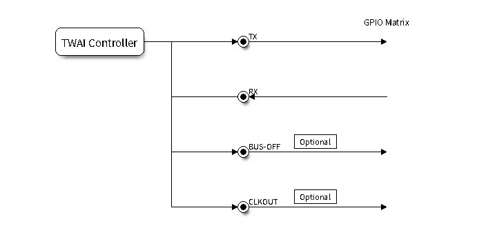The TWAI controller's interface consists of 4 signal lines known as TX, RX, BUS-OFF, and CLKOUT. These four signal lines can be routed through the GPIO Matrix to the ESP32's GPIO pads.
