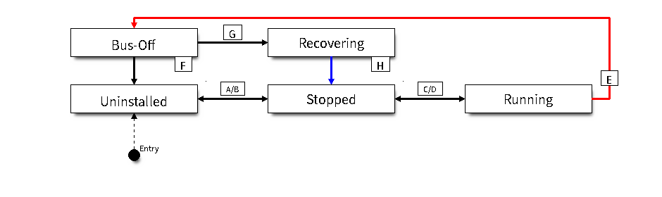 Bus-Off: A node becomes Bus-Off when the TEC becomes greater than or equal to 256. A Bus-Off node is unable influence the bus in any manner (essentially disconnected from the bus) thus eliminating itself from the bus. A node will remain in the Bus-Off state until it undergoes bus-off recovery.